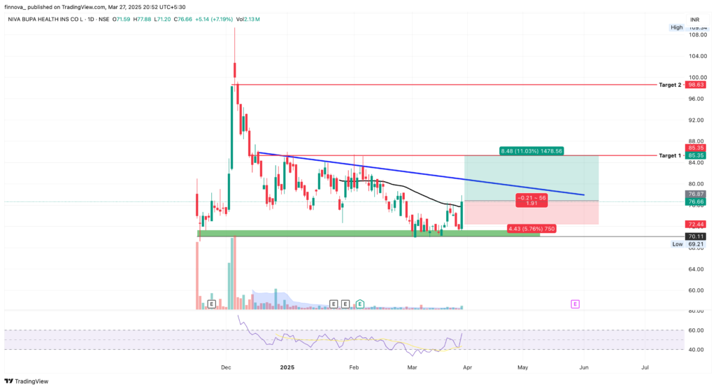 For the past few days, volume has also been quite good. If we enter the stock at ₹76.66, we can achieve the target with